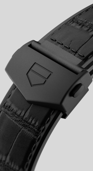 Швейцарские часы TAG Heuer CAR5A5U.FC6377 имеют комбинированный ремешок черного цвета из каучука с накладкой из кожи аллигатора, браслетная застежка из титана с покрытием карбид-титаном, раскладывающаяся при нажатии на предохранительные кнопки двойной блокировки, украшена эмблемой TAG Heuer.