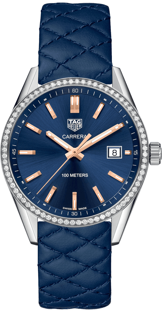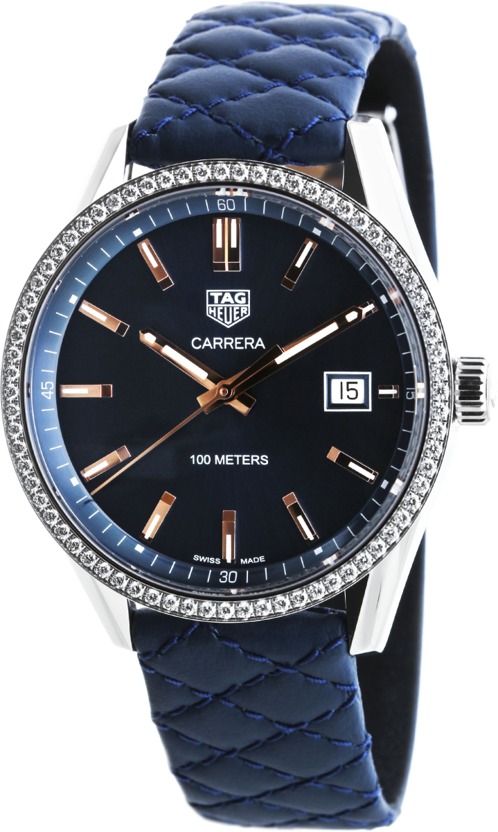 Швейцарские часы TAG Heuer Carrera WAR1114.FC6391 в динамичном и роскошном стиле для современных женщин, вдохновлены автомобильными гонками. Премиальное исполнение и элегантный дизайн. Безель украшен бриллиантами. Круглый корпус TAG Heuer Carrera Ladies Quartz и литой браслет выполнены из нержавеющей стали, кожаный ремешок синего цвета с браслетной застежкой. Изогнутое сапфировое стекло с антибликовым покрытием. Швейцарский кварцевый механизм TAG HEUER с высокой точностью хода и надежностью.