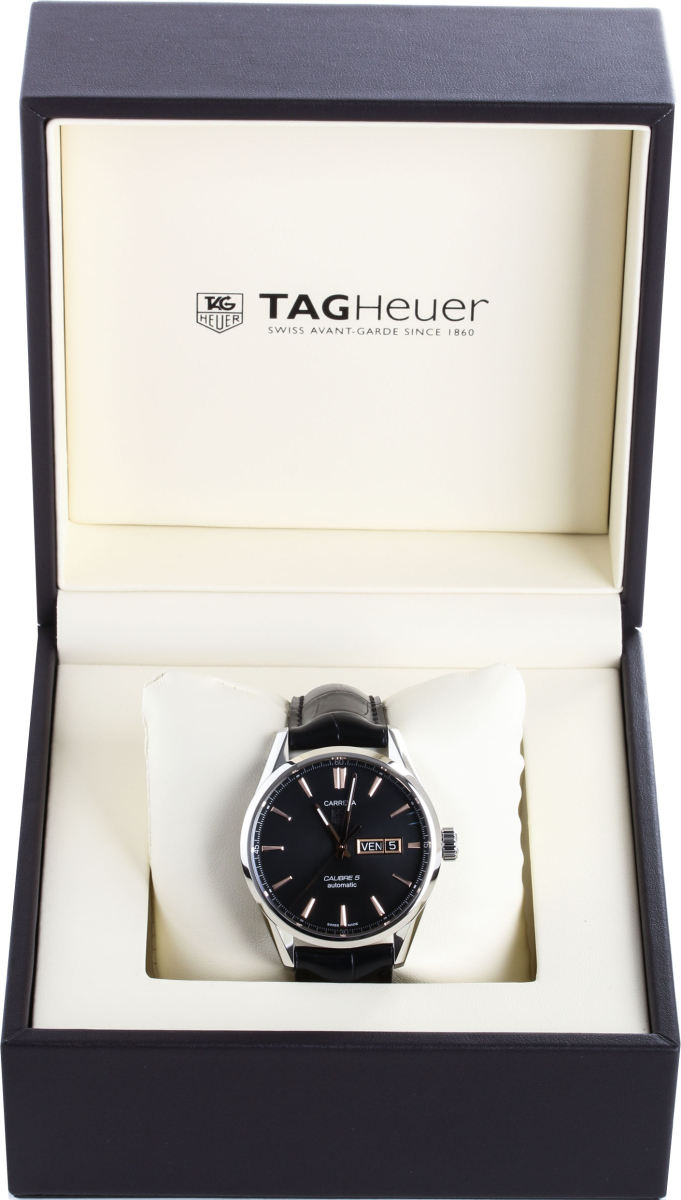 Швейцарский механизм с автоматическим подзаводом Calibre 5 на базе калибров ETA или Sellita персонализированный и декорированный компанией TAG Heuer. Запас хода составляет 38 часов, частота колебаний баланса 28.800 пк/час, 25 или 26 рубинов в качестве камневых опор и палет анкерного спуска. Функции: часовая, минутная и секундная стрелки. Индикация даты и дня недели в двойной апертуре на отметке«3 часа».