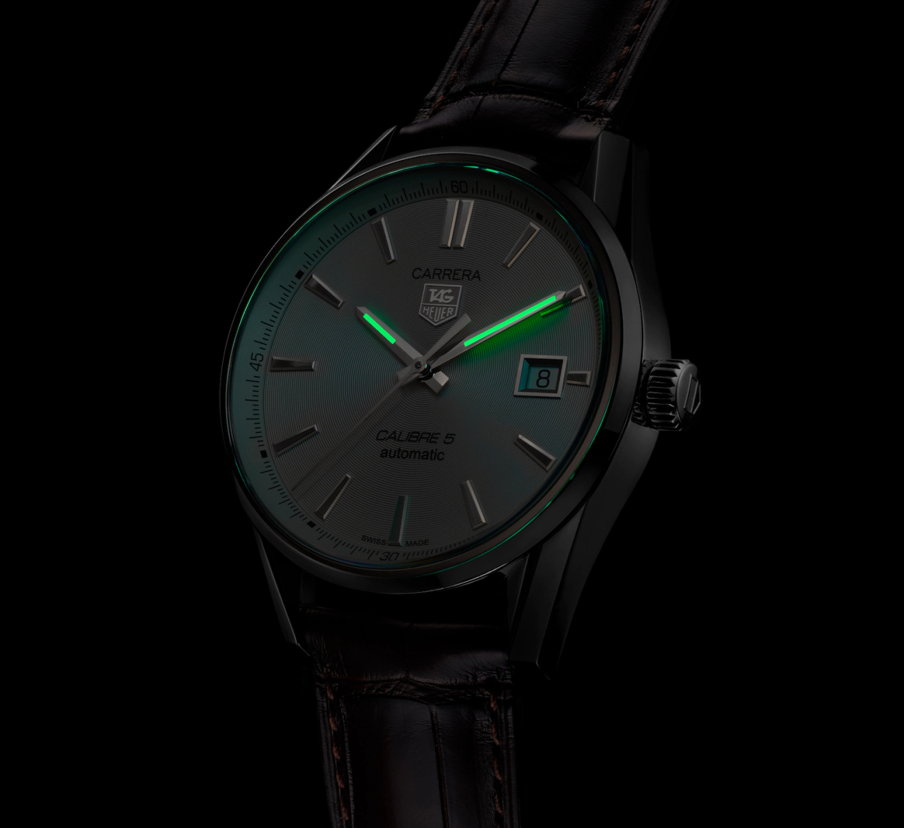 Циферблат серебристого цвета с гильошированием в виде концентрических кругов. Печать эмблемы TAG Heuer. Аппликация часовых индексов и стрелки с покрытием родием, ювелирной огранкой и глянцевой полировкой. Светящееся в темноте покрытие люминофором Superluminova стрелок и разметки циферблата.
