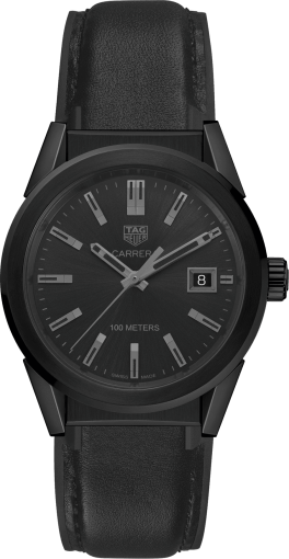 Циферблат глубокого черного цвета со шлифовкой “солнечные лучи”. Аппликация часовых индексов, эмблемы TAG Heuer и стрелки покрытием черным золотом, ювелирной огранкой и глянцевой полировкой. Светящееся в темноте покрытие люминофором Superluminova стрелок и разметки циферблата.