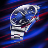 Циферблат глубокого синего цвета с шлифовкой в стиле "солнечные лучи". Аппликация эмблемы TAG Heuer, часовых индексов, окантовки окошка даты и стрелки с покрытием родием, ювелирной огранкой и глянцевой полировкой. Светящееся в темноте покрытие люминофором Superluminova стрелок и разметки циферблата.