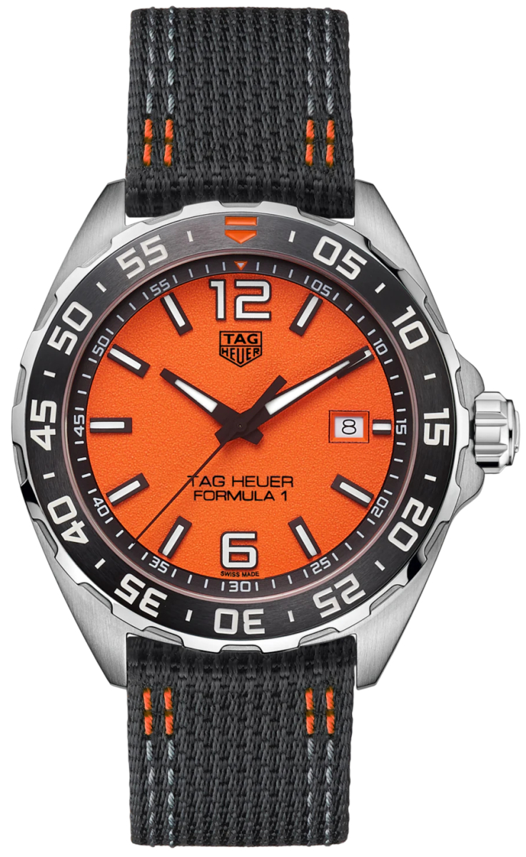 Швейцарские часы TAG Heuer WAZ101A.FC8305 имеют специальный текстильный ремешок в стиле NATO с двойной прошивкой серо-оранжевого цвета, классическая застежка пряжка из нерж. стали.