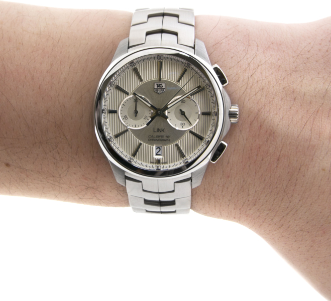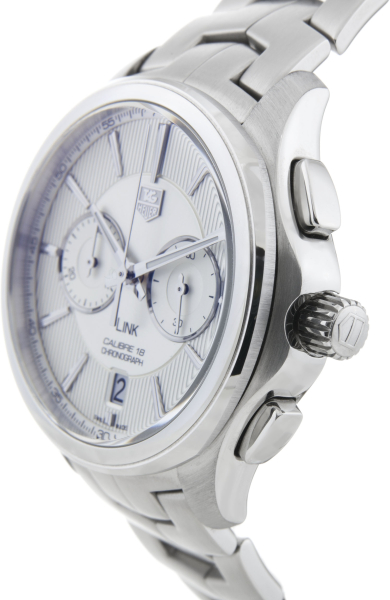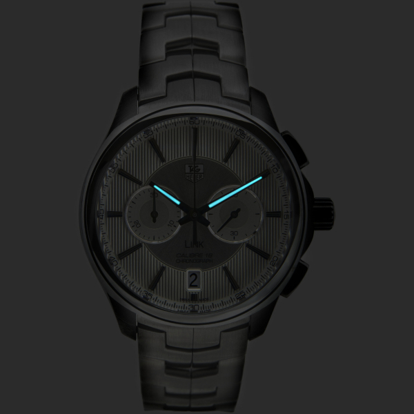 Циферблат серебристого цвета с шлифовкой “солнечные лучи” центральной части и гильошированием в виде продольных полос, дополнительные индикаторы с накладной окантовкой покрытой родием. Печать эмблемы TAG Heuer и разметки, аппликация часовых индексов и стрелки покрытием родием, ювелирной огранкой и глянцевой полировкой. Светящееся в темноте покрытие люминофором Superluminova стрелок.